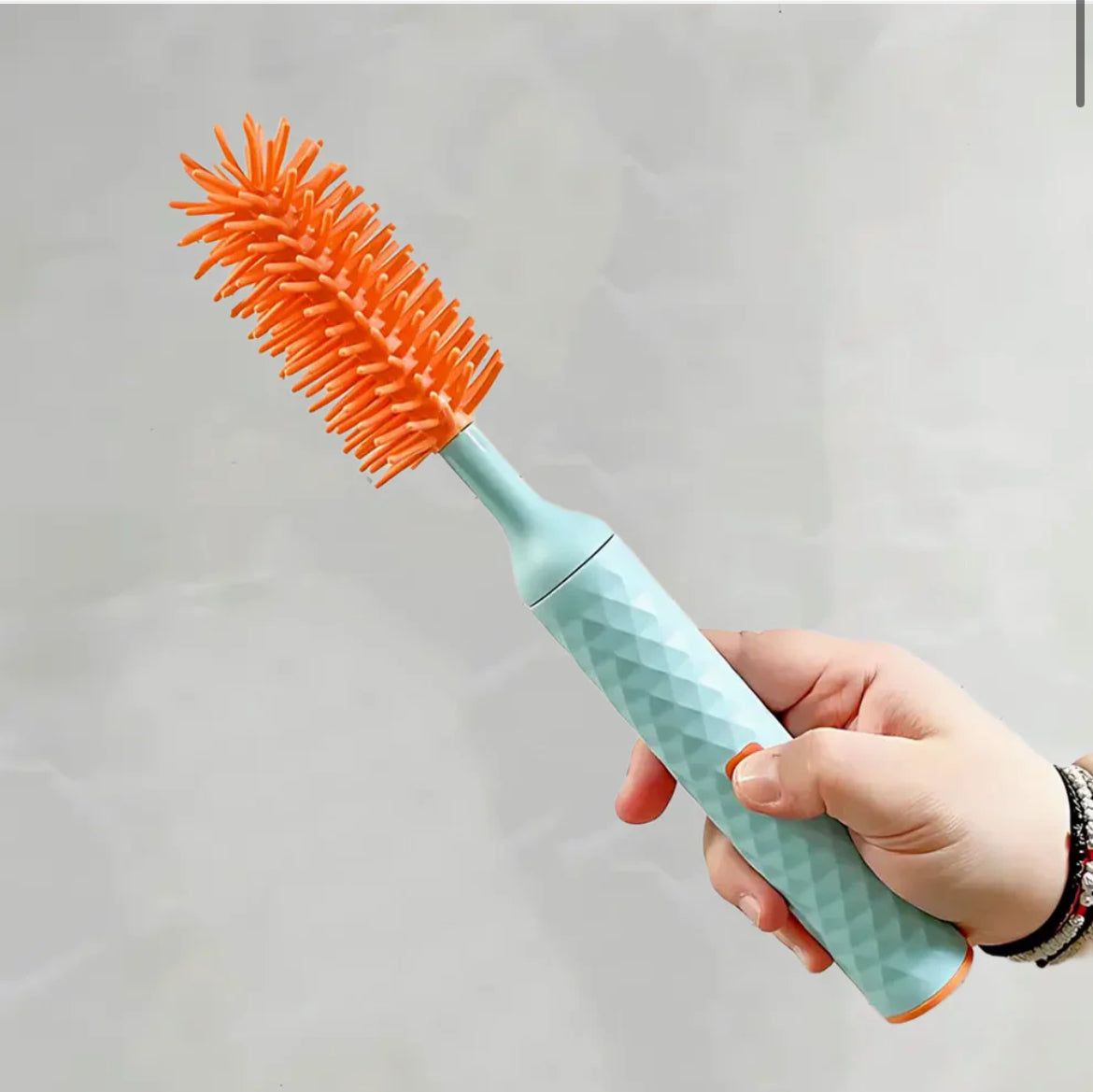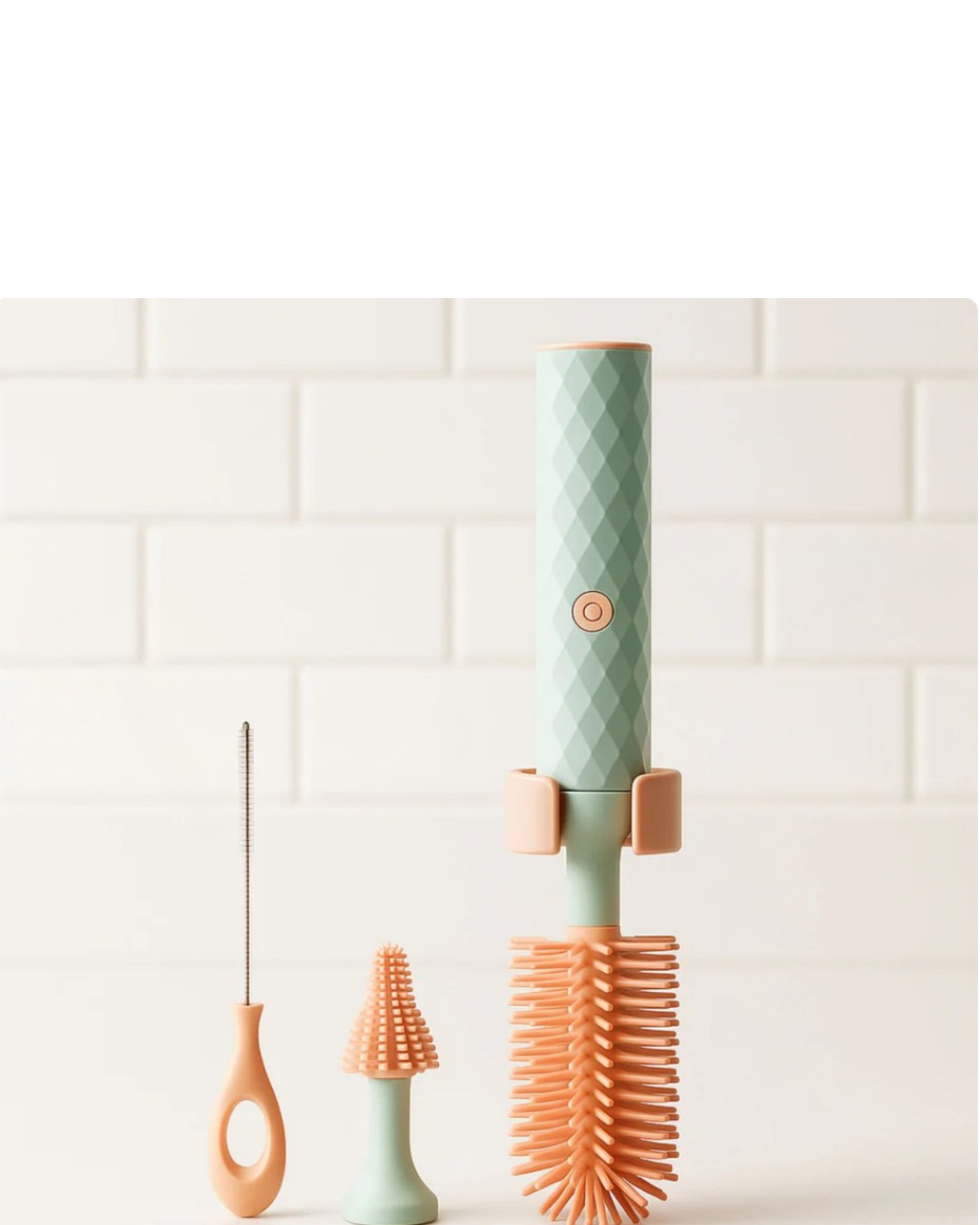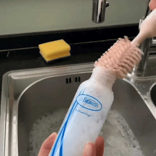 Den roterande silikonborsten tar enkelt bort torkad mjölk, smuts och beläggningar – helt utan skrubb. För snabbare och renare flaskor varje gång.