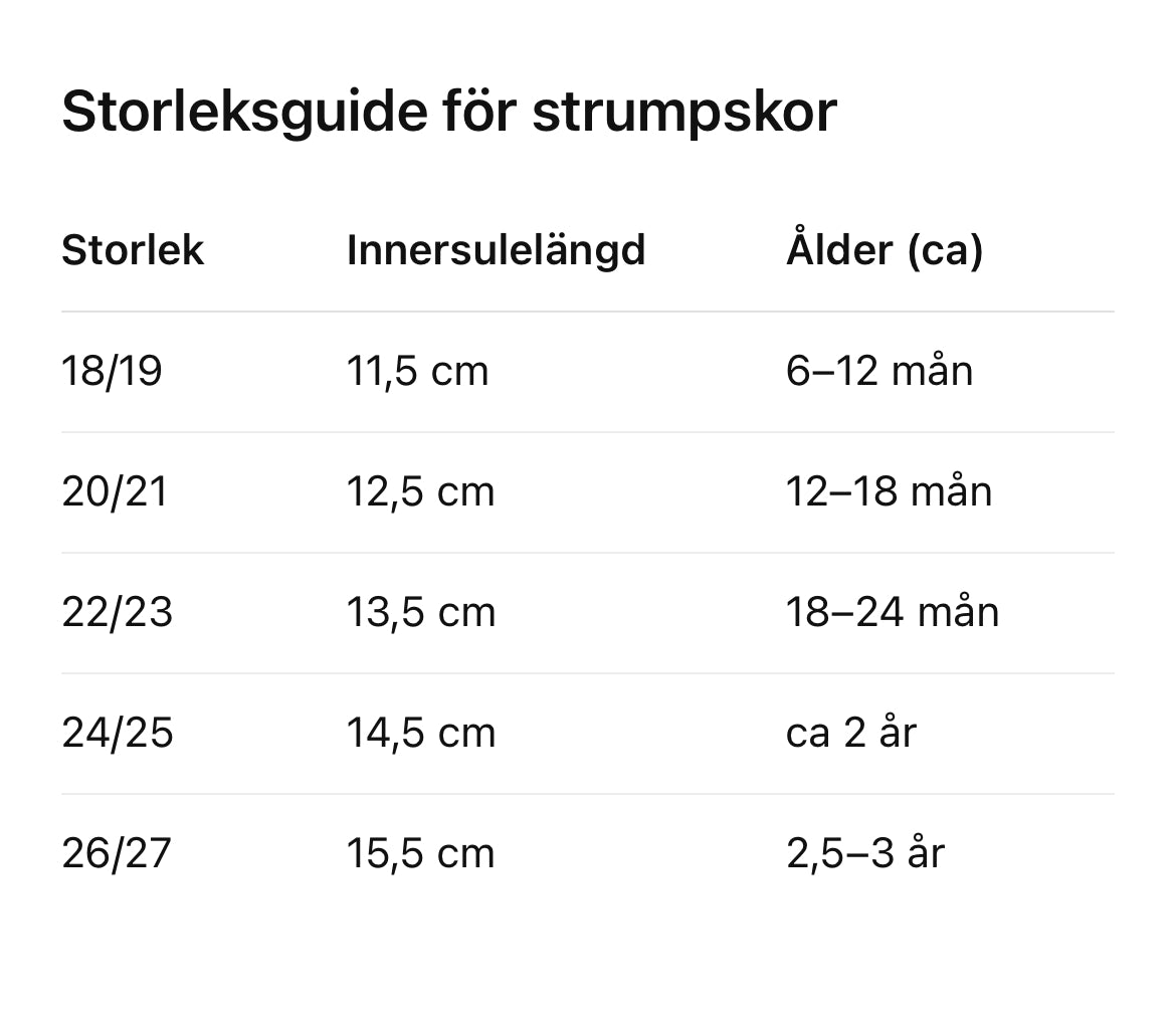 Vill du vara extra säker? Mät barnets fot och lägg till ca 1 cm för att få rätt innermått – då sitter strumpskorna bekvämt och barnet har plats att växa.